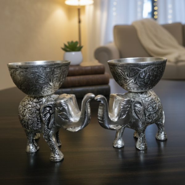 This elegant Silver Hathi showpiece features a beautifully crafted elephant with fine detailing, symbolizing strength, wisdom, and prosperity. Its shiny silver finish adds a modern yet traditional charm to any home or office décor. Perfect for display in living rooms, showcases, pooja spaces, or work desks, it also makes a graceful and meaningful gift for festive and special occasions.