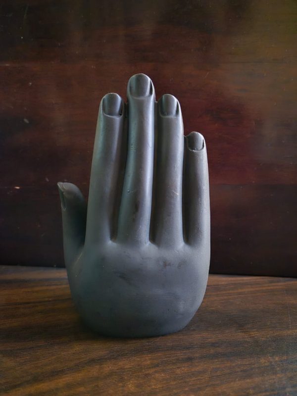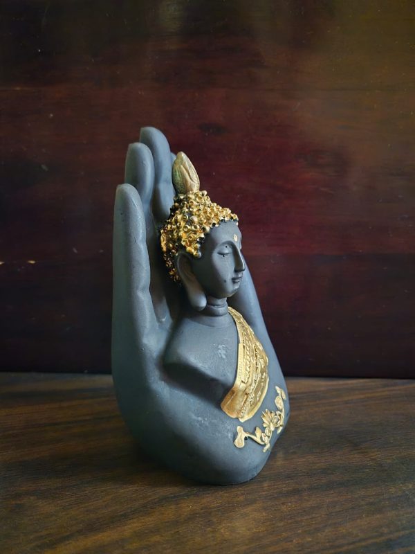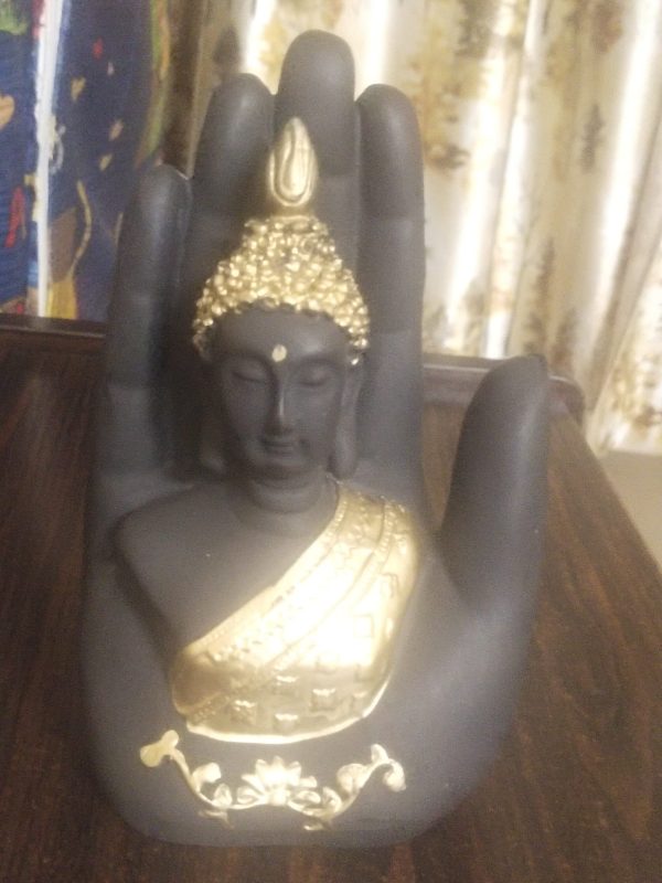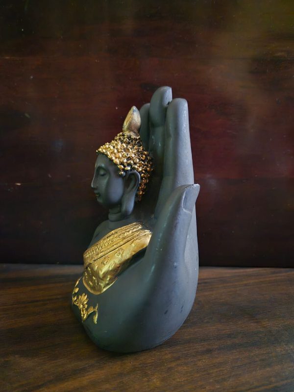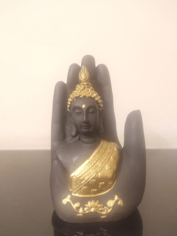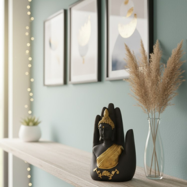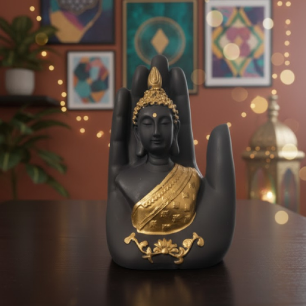 Palm Buddha Golden is a beautifully handcrafted resin showpiece featuring a serene Buddha face enclosed within a golden protective palm. It comes with an integrated potpourri and T-light holder, creating a soothing ambience. This elegant décor piece adds spiritual charm, warmth, and positivity to living rooms, meditation corners, offices, and festive settings.