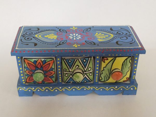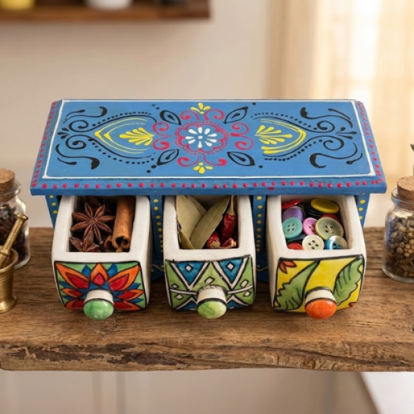 Add color and elegance to your space with the DIWAM Handicrafts Wooden Mini Chest Drawer Organizer Set. Featuring beautiful hand-painted ceramic floral designs, these rectangular mini drawers are crafted from quality wood with fine detailing. Ideal for organizing jewellery, accessories, and small essentials, they also enhance décor on dressing tables, shelves, and desks. A perfect gifting option for festivals, housewarmings, and special occasions.