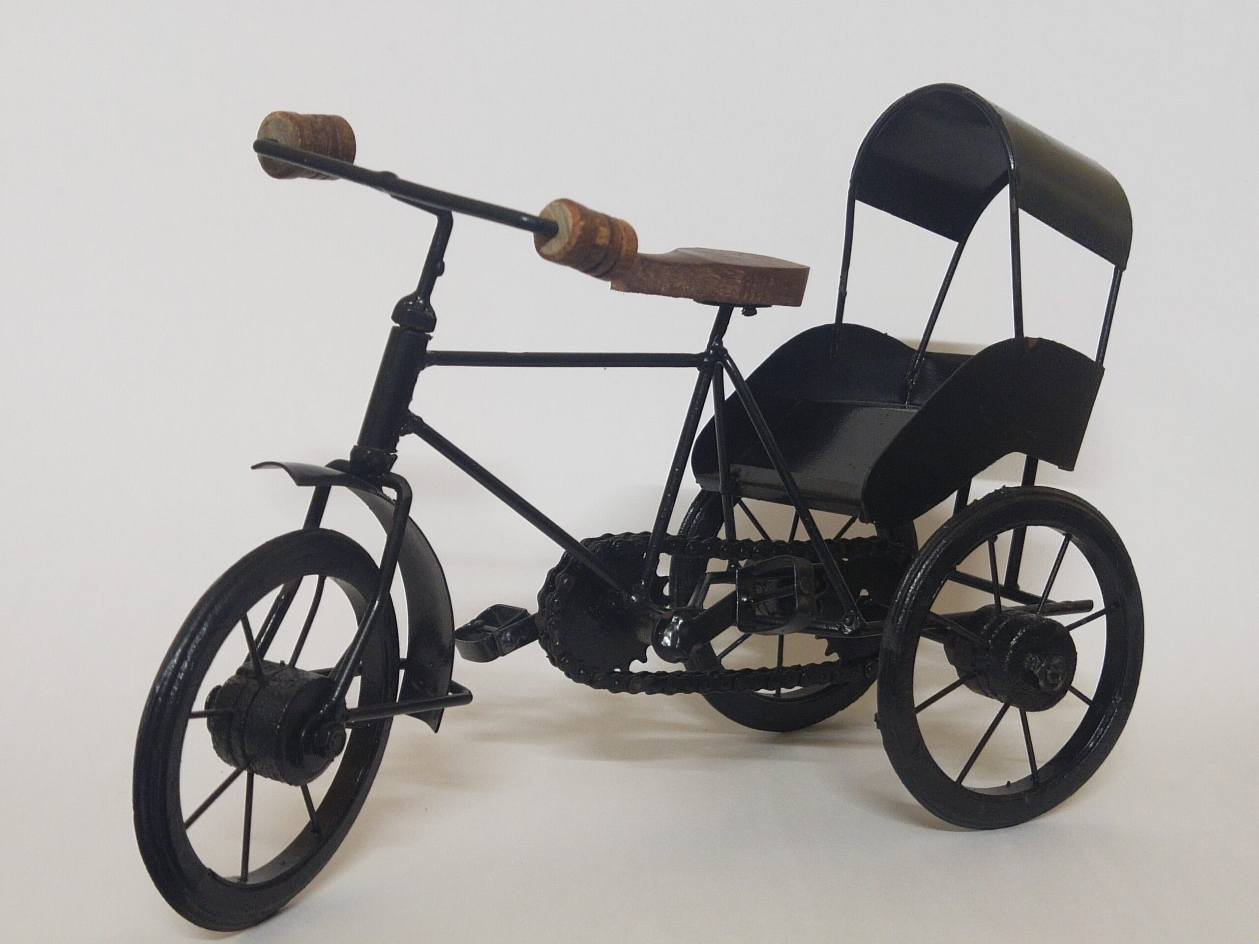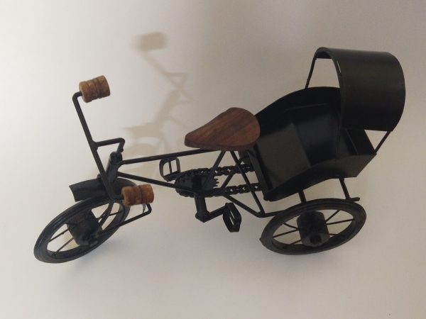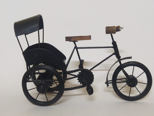 • Handcrafted metal cycle rickshaw showpiece designed with fine detailing and a classic vintage look. The working wheels add a realistic and attractive touch to the miniature design.